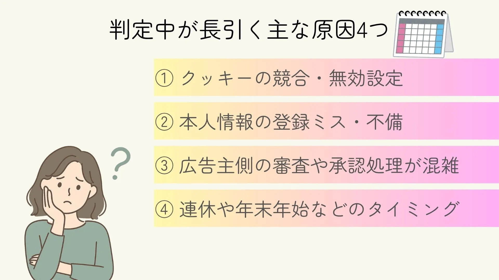 - 判定中の多くは「クッキー設定」や「承認混雑」が原因